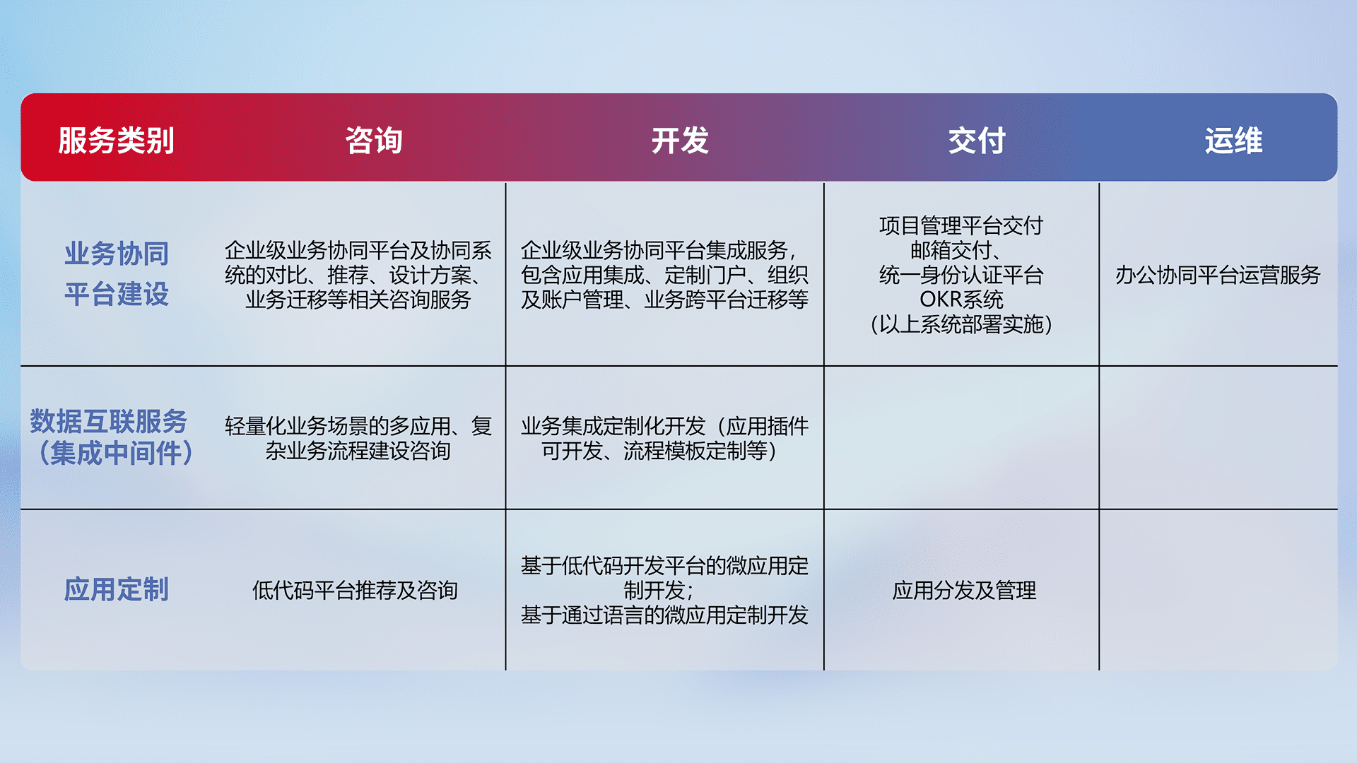 针对钉钉、、、、企微、、、、IDaas等平台级产品提供产品的规划、、方案、、交付、、、、定制化开发等服务,,,,实现如统一协同办公、、智能客户服务、、混合会议管理、、、、智能数据查询、、、等业务场景,,,实现数字化转型。。。。